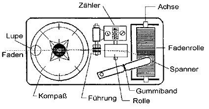 Der Vermessungsfaden wird zwischen den beiden Messpunkten gespannt. Die Messung erfolgt, indem die Peillinie des waagerecht gehaltenen Kompass mit dem Faden zur Deckung gebracht wird oder ein Hängekompass eingesetzt wird. Bei steilen Peilungen ist diese Methode leider sehr ungenau.
