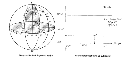 Positionen können durch ihre geografischen Koordinaten beschrieben werden. Dabei wird die geografische Länge und Breite in Grad (1° Breite = 111,3 km, 1° Länge bei 50° Breite = 71,7 km) angegeben. Die Länge bezieht sich auf den Nullmeridian in Greenwich (180° W bis 180° E), die Breite auf den Äquator (90° S bis 90° N).