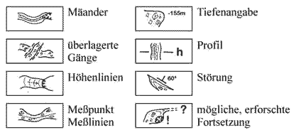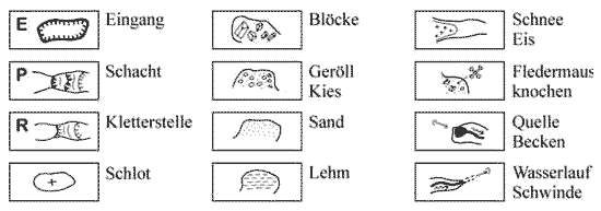 Die Signaturen für die Höhlenkartografie sind international weitgehend genormt, einheitliche Notationen wurden von der UIS festgelegt (siehe Cave Symbols - The official UIS list).