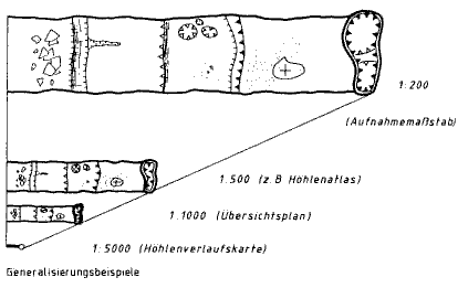 Auf dem endgültigen Höhlenplan wird für Grundriss, Längsschnitt und Profile jeweils ein Maßstabsbalken dargestellt. Die Angabe des Maßstabs ist nicht wünschenswert, da er durch Verkleinerung des Plans nicht mehr stimmt. Der Grundriss wird außerdem mit einem Nordpfeil versehen. Sich überlagernde Höhlenteile können nebeneinander gezeichnet werden.
