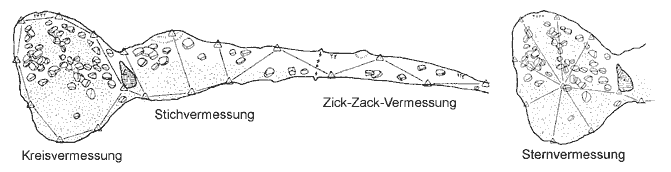 Die Auswahl der Messpunkte ist maßgebend für die spätere Zeichnung. Normalerweise werden markante Steine, Zacken oder Seilaufhängungen gewählt. Weniger auffällige Messpunkte, sollten mit roter Farbe, Nagellack oder Ruß markiert werden. Bei kleinen Gängen genügt es den Gangquerschnitt anzugeben, in breiten Gängen arbeitet man mit Zickzack- oder Stichvermessungen. Hallen werden von einem zentralen Punkt oder entlang der Wand vermessen.