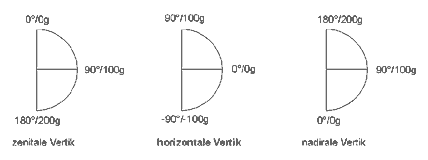 Die Neigung (n) kann in verschiedenen Vertiken (zenital, horizontal, nadiral) angegeben werden. Dabei liegt der Nullpunkt entsprechend oben, auf der Waagerechten oder unten.