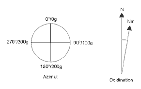 Die Angabe des Azimuts bzw. Kompasswinkels (a) kann in Grad (360°) oder in Gon (400g) erfolgen. Bei Vermessungen ist die Deklination, d. h. die Abweichung zwischen geografischem und magnetischem Nordpol am Kompass zu korrigieren bzw. zu dokumentieren und auf die gemessenen Werte zu addieren.